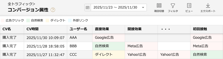ラストクリックだけでなく、その前の接点も含めて、成果への影響を正しく把握できます。