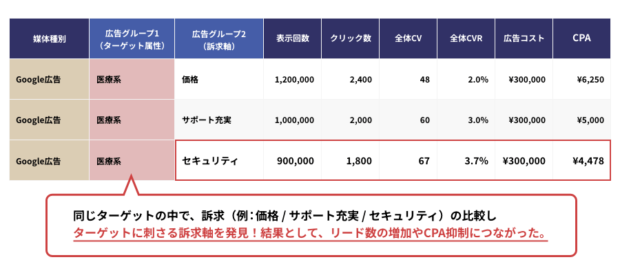 たとえば媒体名、キャンペーン名、ターゲット属性、訴求軸ごとにグループを作成し、ABテストで最適な組み合わせを検証。