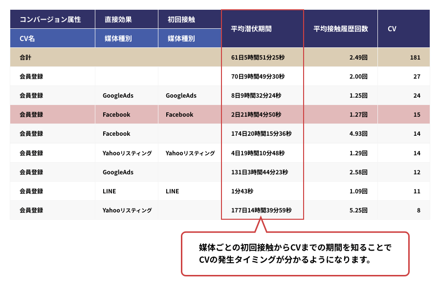 BtoCでは、広告への初回接触からコンバージョンまでの「平均潜伏期間」の可視化が非常に有用でした。